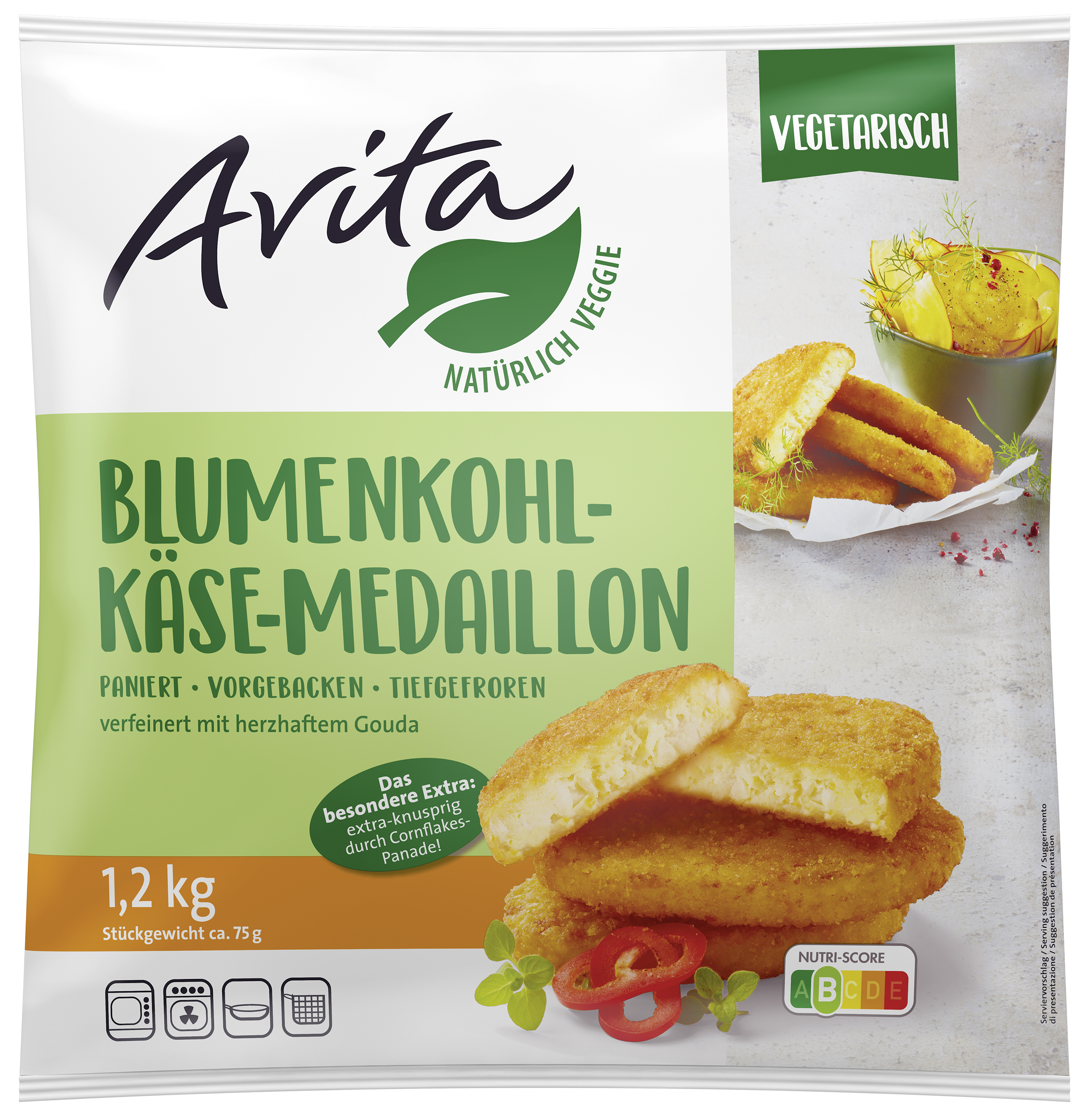 Hergestellt aus 52 % frischem Blumenkohl, herzhaftem Käse und feinen Gewürzen wird das leckere Medaillon von einer knusprigen Cornflakes-Panade ummantelt. Combidämpfergeeignet. VORGEBACKEN