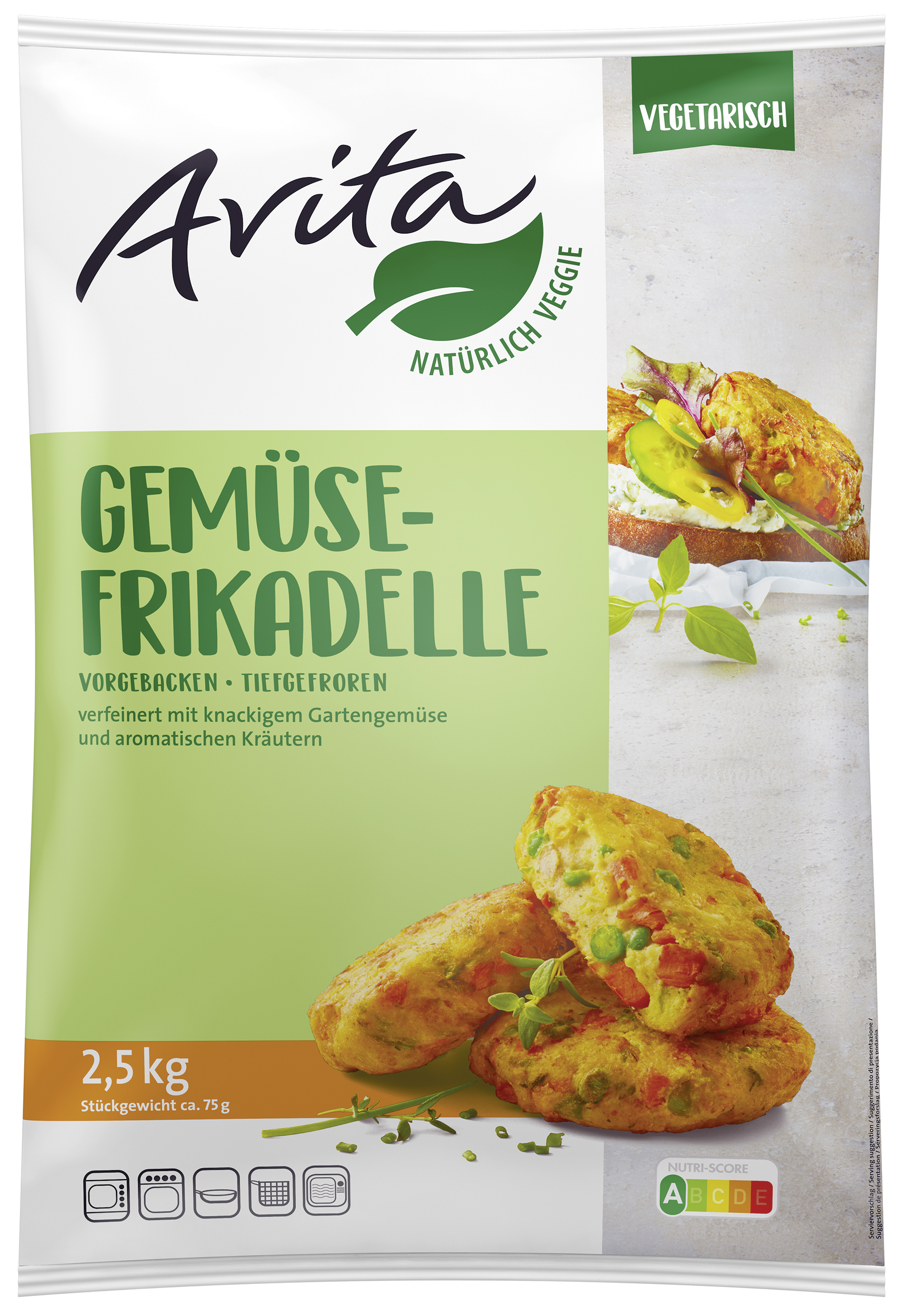 Gemüse-Frikadelle im 75 g-Format: Hergestellt aus hochwertigem Gemüse wie Möhren, Pastinaken, Erbsen, Mais und Kohlrabi. Ohne Panade. VORGEBACKEN