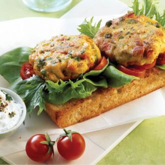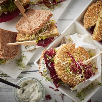 auf Ciabatta mit Salatbeilage und Joghurt-Dipp