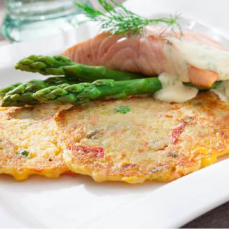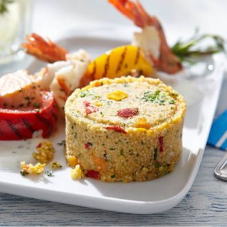 mit Lachs-Scampi-Spieß und Joghurtsauce