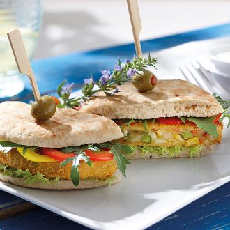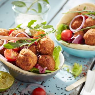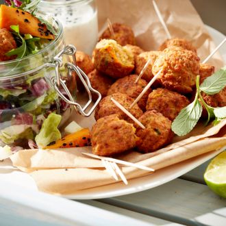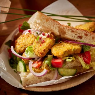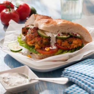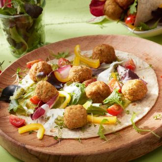 Kürbis-Falafel im Naanbrot auf Salatbett
